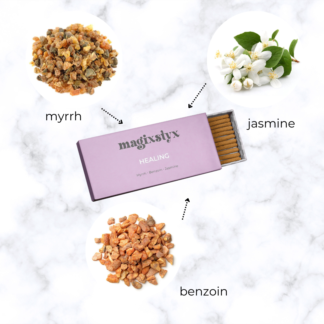 The Magixstyx Healing incense is thoughtfully curated to enhance physical, mental, emotional, and spiritual well-being. This aromatic fusion incorporates benzoin, myrrh, and jasmine—ingredients renowned for their healing properties. As the incense softly smolders, the comforting vanilla notes of benzoin, the earthy sweetness of myrrh, and the floral radiance of jasmine collaborate to establish a therapeutic ambiance, fostering the restoration of balance and harmony within.